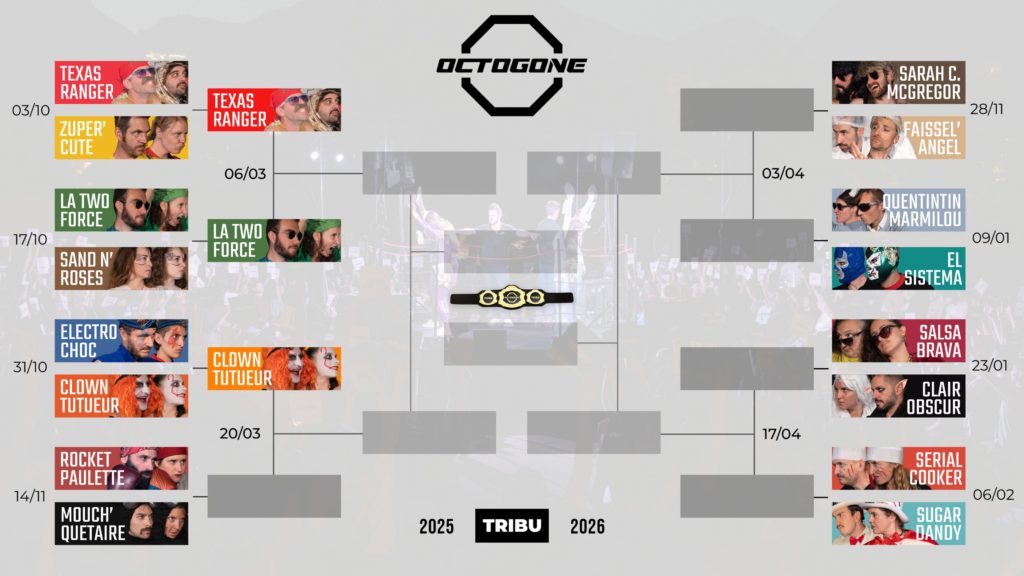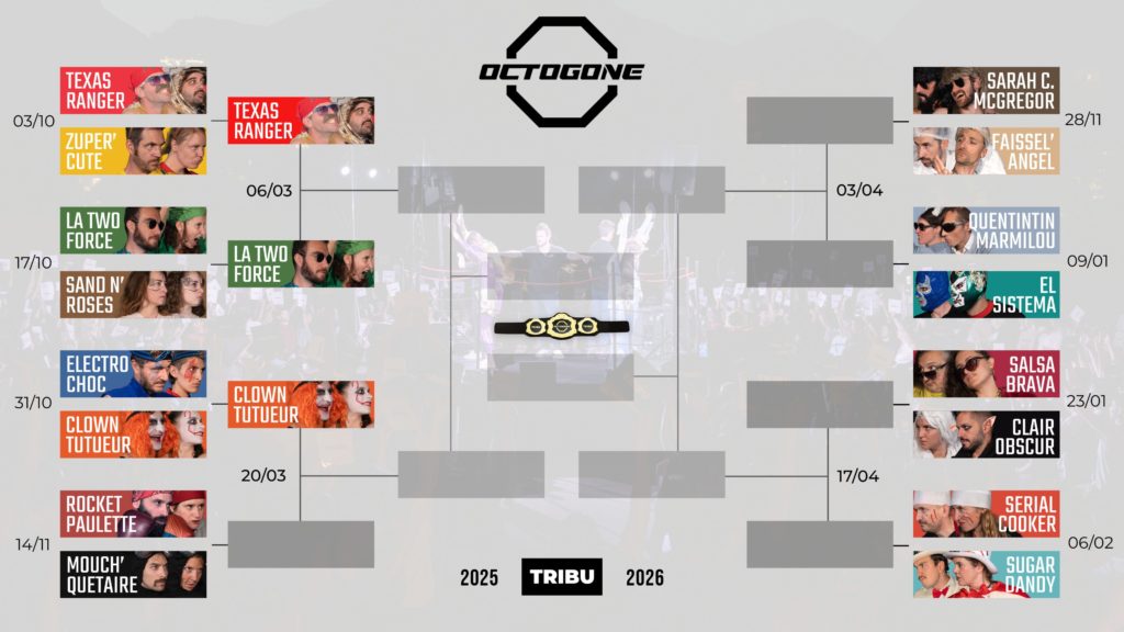 Le spectacle Octogone met à l’épreuve les challengers dans des improvisations courtes arbitrés d’une main experte. Mais seul le public décide qui l’emporte à la fin de la soirée !
