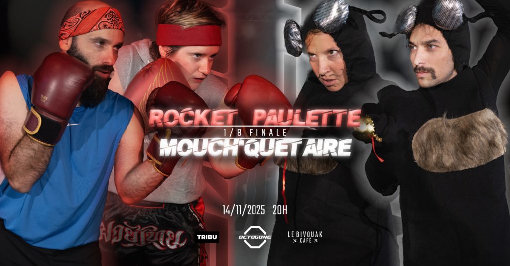 Rocket & Paulette arrivent tout droit de Lyon pour un affrontement sans précédent ! Les deux challengers ont à leur actif plusieurs titres de champion et championne en compétition lyonnaise. Les Mouch’Quetaires devront donner leur maximum pour espérer l’emporter ! Verdict de vendredi 14 novembre à 20h au Bivouak Café !