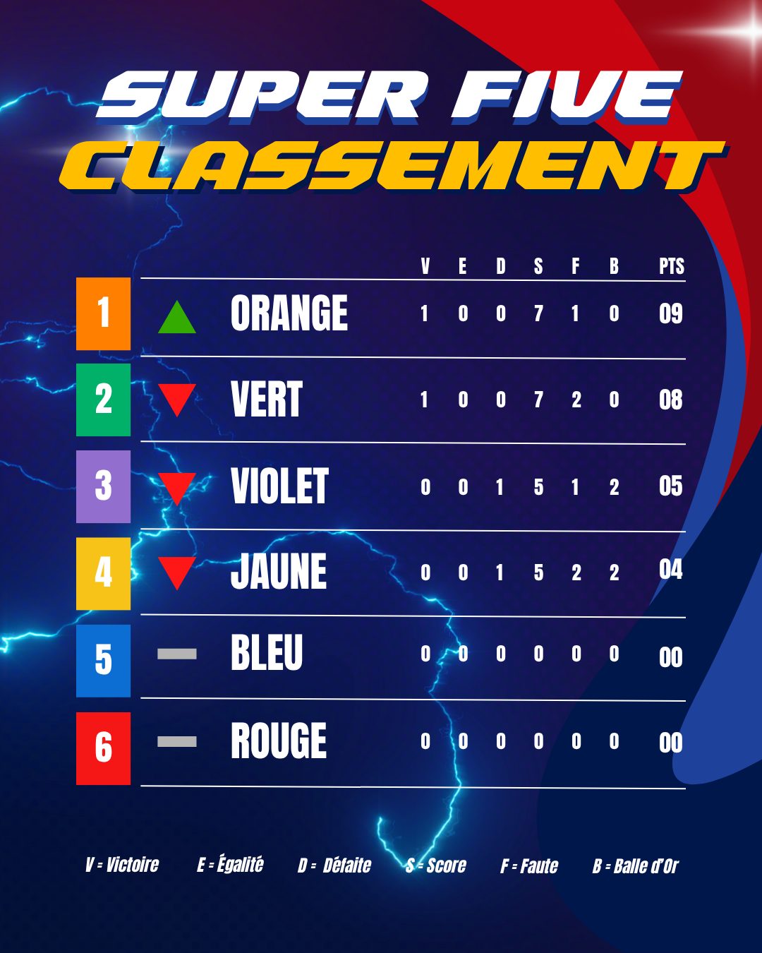 Une victoire vaut 3 points, une égalité vaut 2 points, une défaite vaut 1 point. Le score représente le nombre total de manches remportées. Chaque faute fait perdre 1 point. Les nombre de balles d’or gagnées sert de bonus en cas d’égalité.